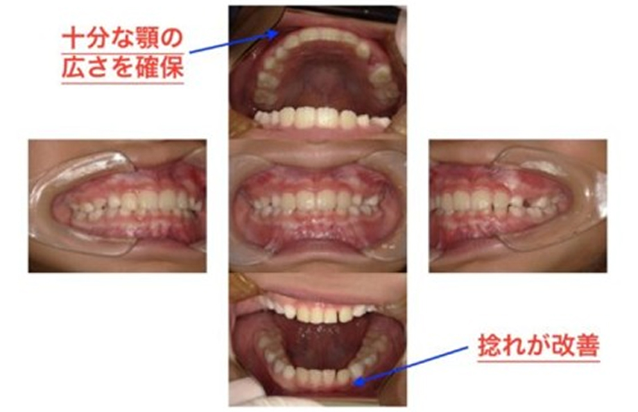 | 治療方法 | 診断名:上下顎叢生歯列弓 年齢:6歳スタート〜7.5歳 経過 治療に用いた装置:上下拡大床(弾線付き・指様弾線付き) 斜面板 ※全て取り外し管理可能な装置です。夜間に主に使用。 抜歯部位:なし 治療期間:1.6年 患者様の声:親である自分の歯ががたがたなので心配だった。 これなら大人の歯が入りそうで安心した。 取り外せるので歯ブラシしやすい。虫歯の心配が少なくてよかった。 |